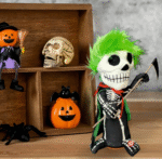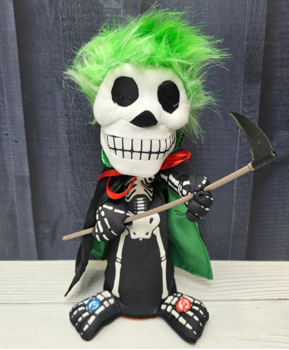Step into the dark side of the stage with Grim Shredder, the ultimate green-haired ghoul of the Skeleton Rockstars band! With his glowing grin and wild neon locks, Grim Shredder holds a menacing scythe that makes him look like the reaper of rock itself. His chilling presence and bold styling make him the perfect piece to send shivers down every spine.
