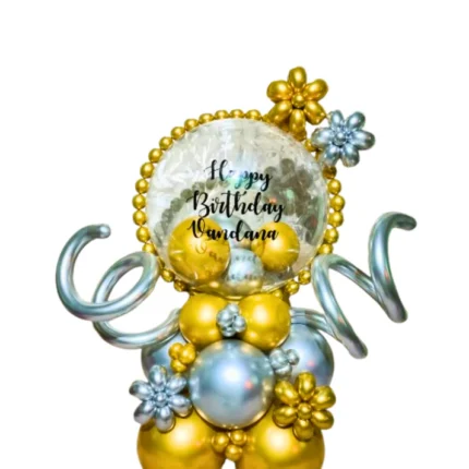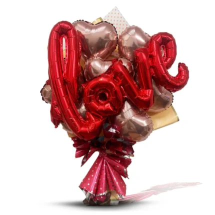 Pink Flower Balloons with Silver Sticks and Love Bouquet