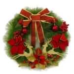 Elegant Gold Reindeer & Sparkling Accents: Two beautifully detailed gold reindeer ornaments sit at the center of the wreath, adding a magical and festive touch. Glittering gold leaves, metallic ornaments, and a bold red-and-gold ribbon bow enhance the overall Christmas sparkle.