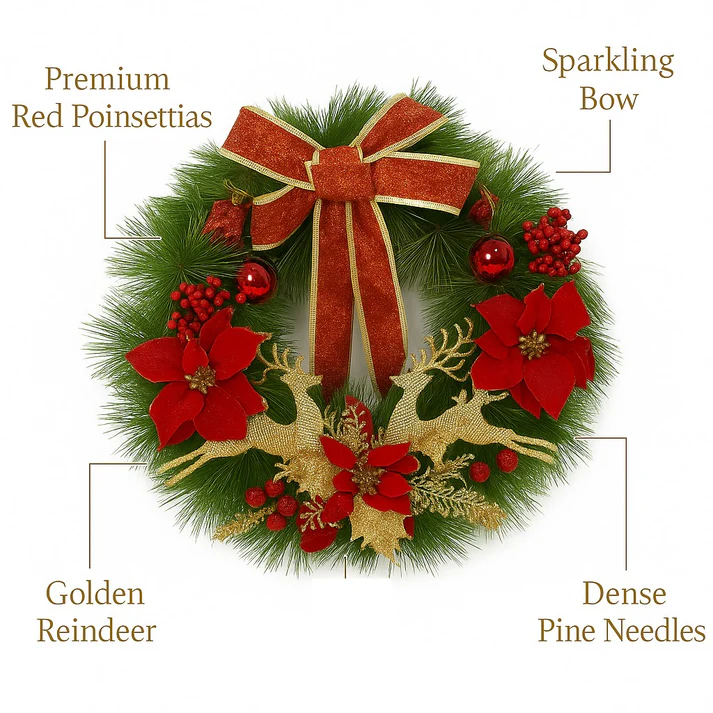 Beautiful 18-Inch Christmas Wreath in Classic Red & Green: This lush 18-inch holiday wreath features realistic pine needles accented with vibrant red berries, poinsettias, and golden décor elements. Designed to bring traditional Christmas charm to your front door, window, wall, or mantle.