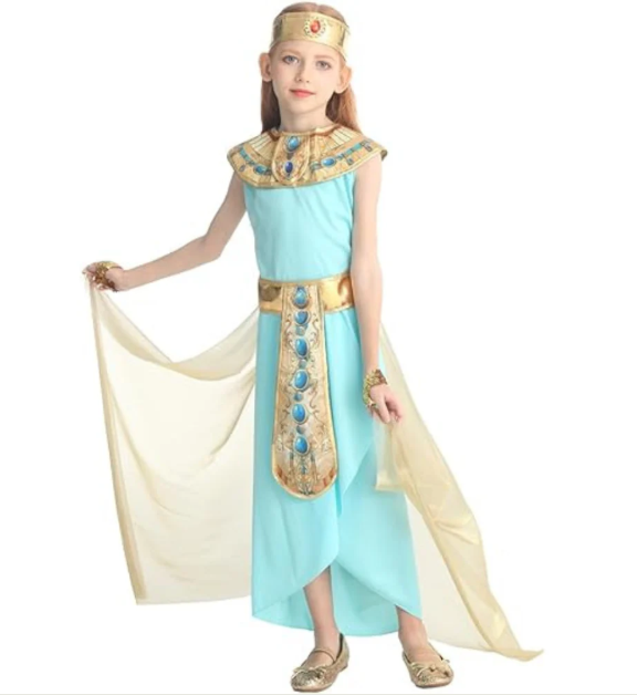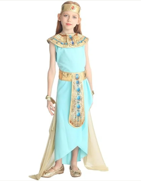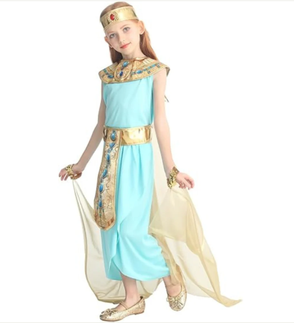 Step into the elegance of Ancient Egypt with the Golden Princess of the Nile costume! With its flowing aqua design and shimmering golden accents, this royal outfit transforms your child into a true Egyptian princess — perfect for Halloween, school plays, or themed dress-up events.