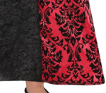 Elegant long dress with rich red velvet patterns and flowing black accents