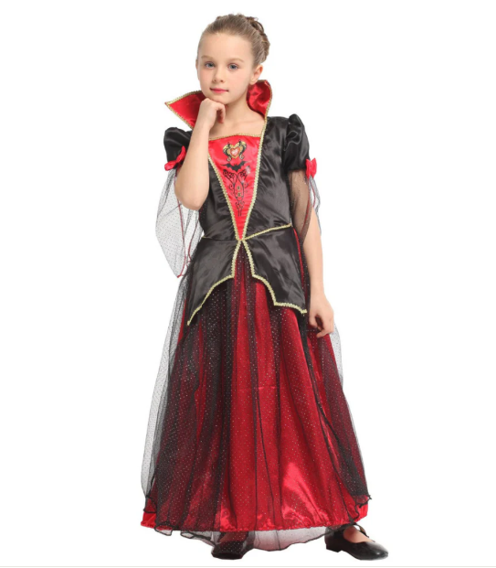 Step into a world of dark royalty with the Vampire Queen of Hearts costume! With its regal red-and-black design and dramatic vampire flair, this outfit transforms your child into the ultimate queen of the night — perfect for Halloween, school plays, or fantasy dress-up.