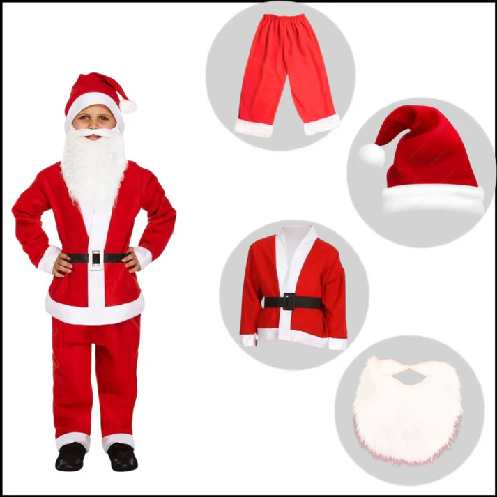 Complete Festive Set: Includes a Santa jacket, trousers, cap, and bag. Accessorize yourself with a beard and belt for an add on look.