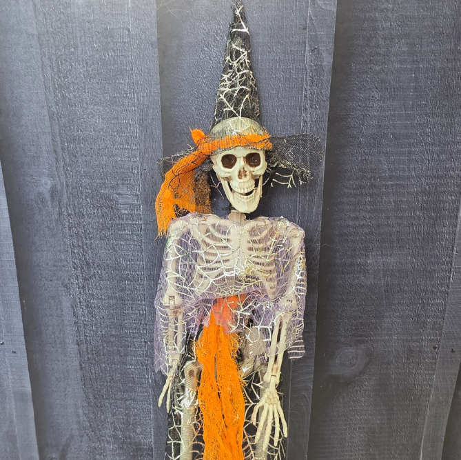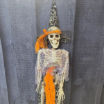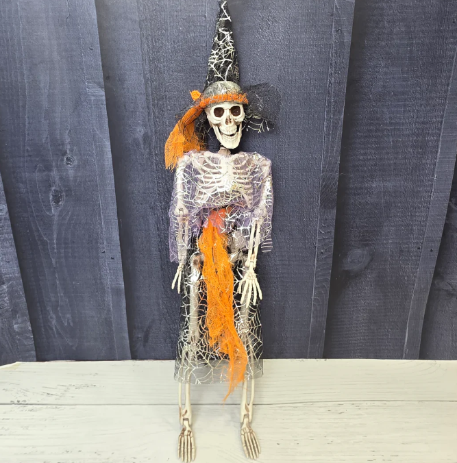 Cast a chilling spell with Wicked Bones, a skeleton witch in a tattered silver web-patterned gown and pointed hat. With her eerie grin, flowing orange scarf, and haunting details, she’s ready to bring a magical fright to your Halloween night.